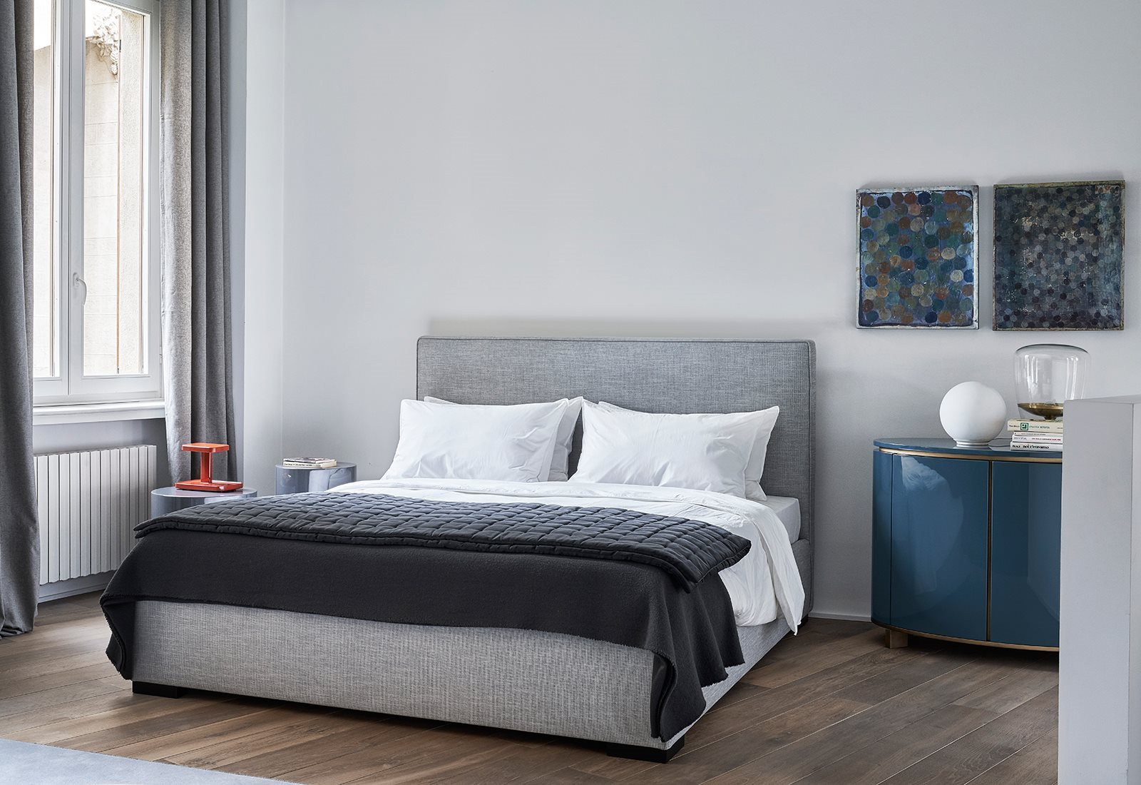 Elliot. Szafka z lakierowanego drewna z dwojgiem drzwi i jedną półką. Ujmuje zaokrąglonym, czystym kształtem i wykończeniem pozwalającym dopasować ją i do salonu, i do sypialni. Szeroka gama kolorystyczna, lakier matowy lub błyszczący, a kontrastująca z tym rama proponowana jest w intrygującym brązowionym mosiądzu, który nadaje Elliotowi cechy biżuterii.